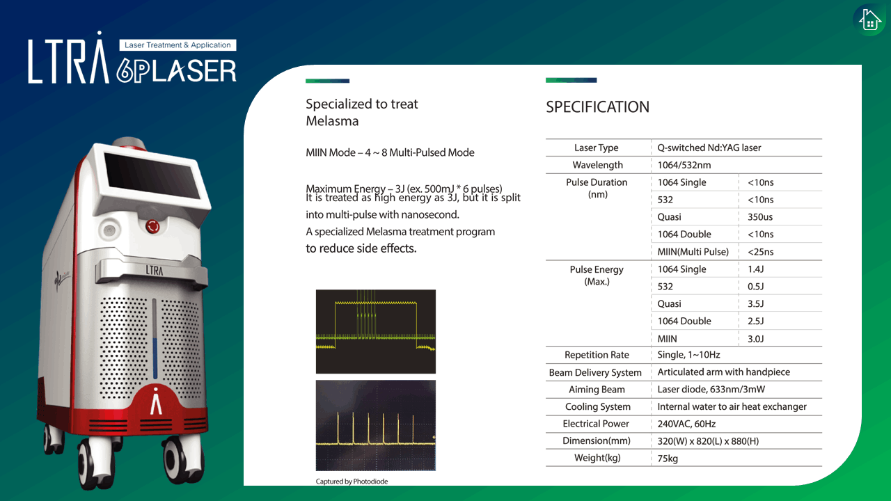 The first and only ND YAG laser with 6 pulses in nanosecond - Uniform Beam Profile - Excellent Durability - Low Maintenance Cost - User Friendly Interface