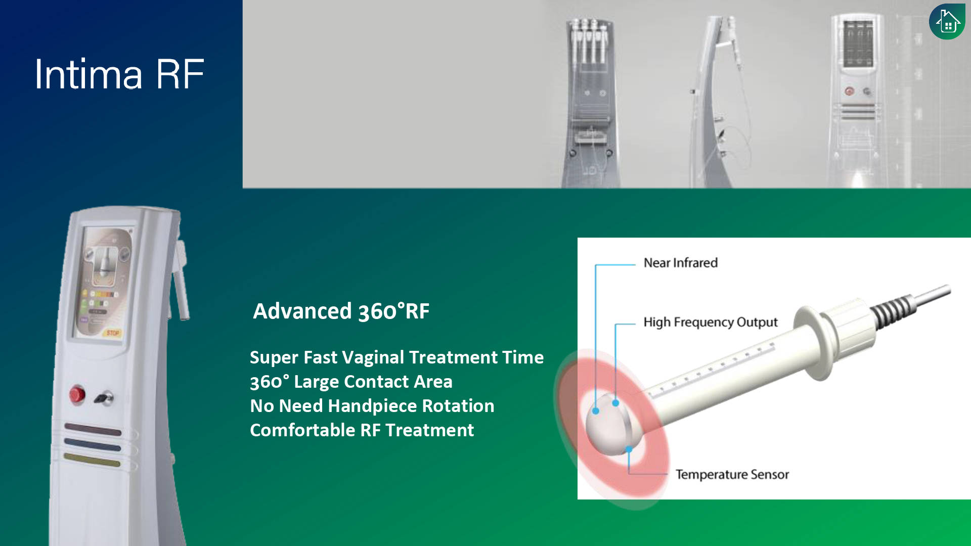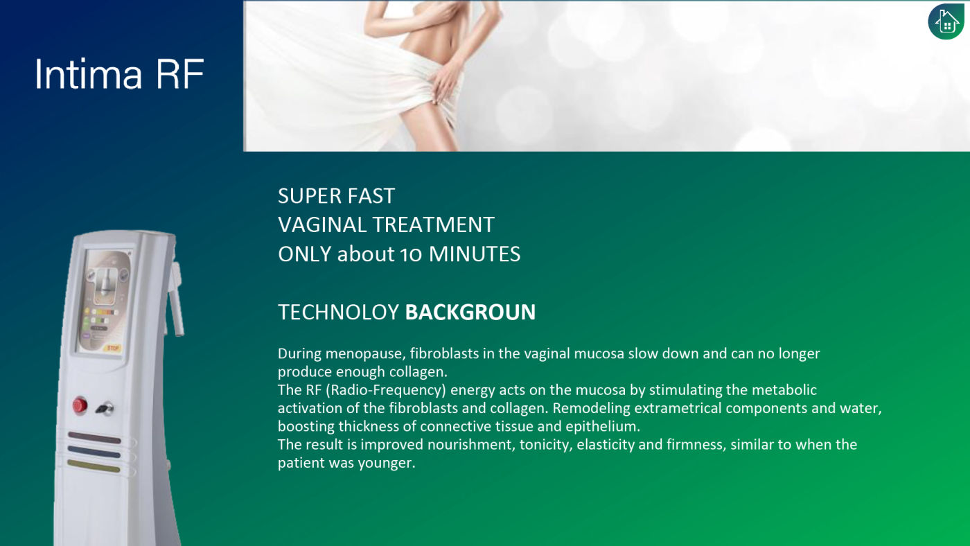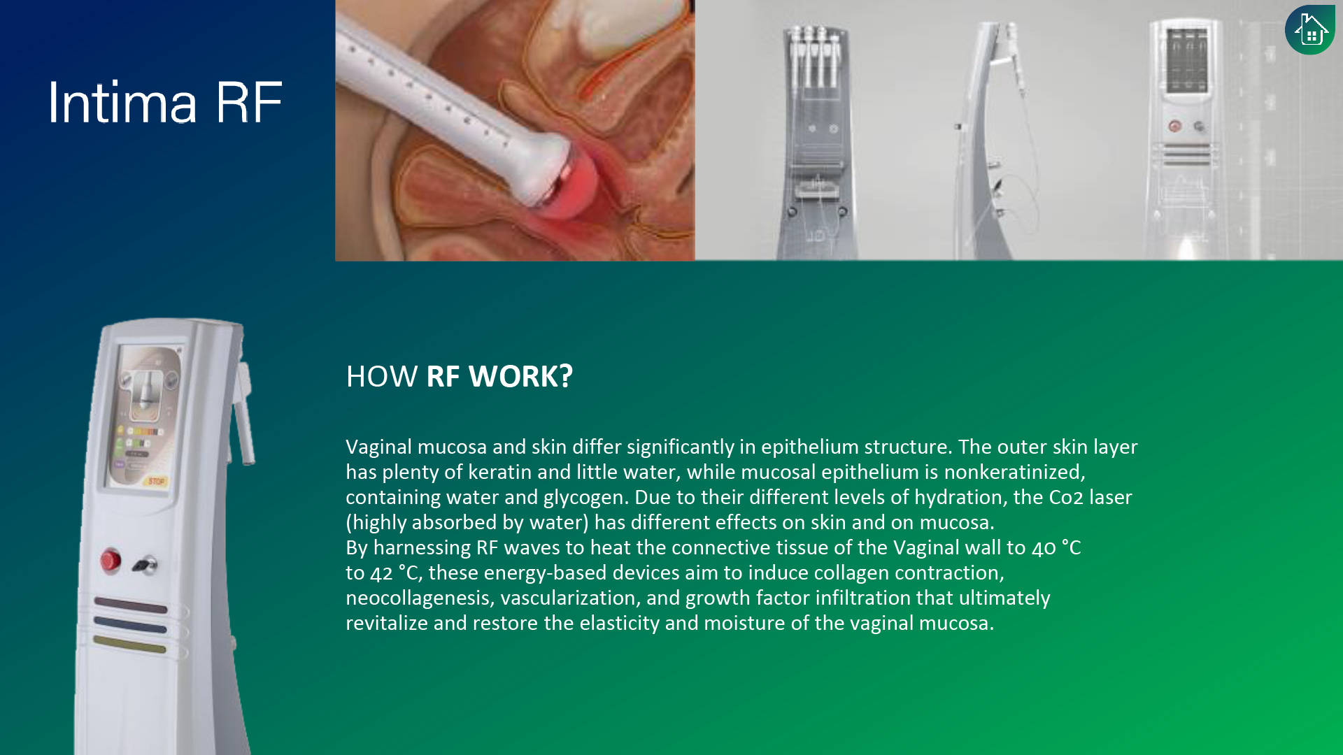During menopause, fibroblasts in the vaginal mucosa slow down and can no longerproduce enough collagen.The RF (Radio-Frequency) energy acts on the mucosa by stimulating the metabolicactivation of the fibroblasts and collagen. Remodeling extrametrical components and water,boosting thickness of connective tissue and epithelium.The result is improved nourishment, tonicity, elasticity and firmness, similar to when thepatient was younger.