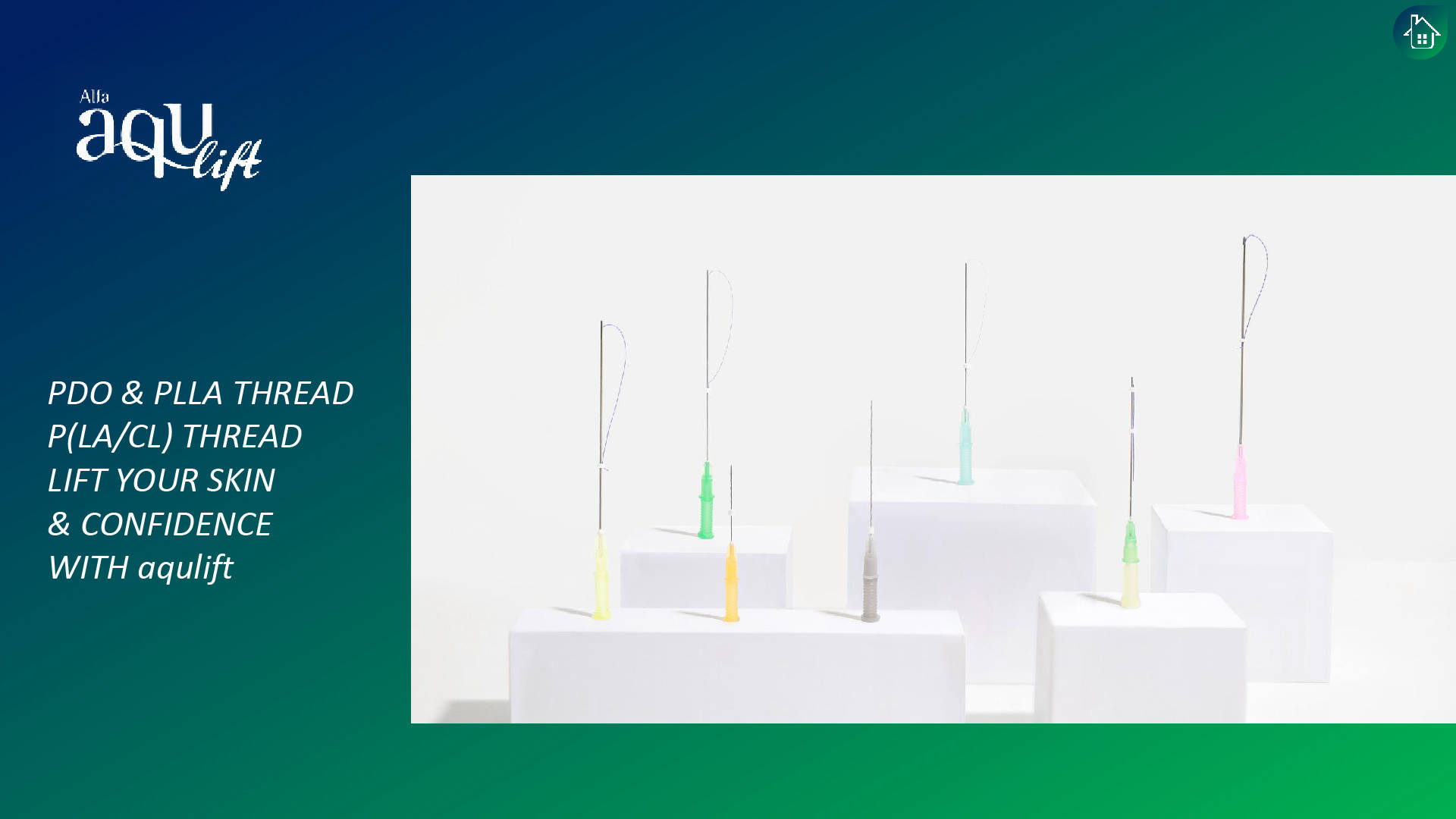 aqulift consists of needle and Polydioxanone(PDO) or Poly-L-Lactic Acid(PLLA) thread. aqulift is intended for being inserted into skin, causing artificial wound. It induces healing effect of the body itself followed by tightening and lifting effect. The safety of the threads are verified as they have been used sewing wound in normal hospitals since 2001. Also they are biocompatible and biodegradable.